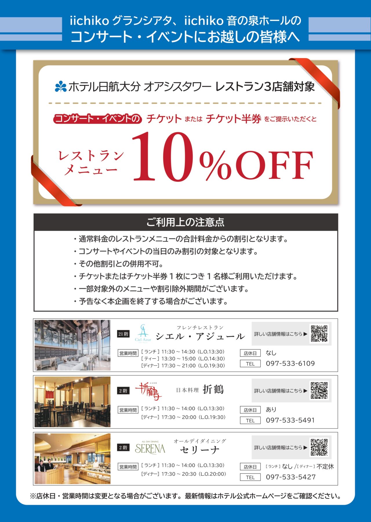 11月1日(土)より、iichiko総合文化センター(iichikoグランシアタ/iichiko音の泉ホール)と大分県立美術館で開催される催しのチケットを、ホテル日航大分 オアシスタワー内の対象レストランでご提示いただくと、レストランメニューが10%割引となるサービスがスタートします。